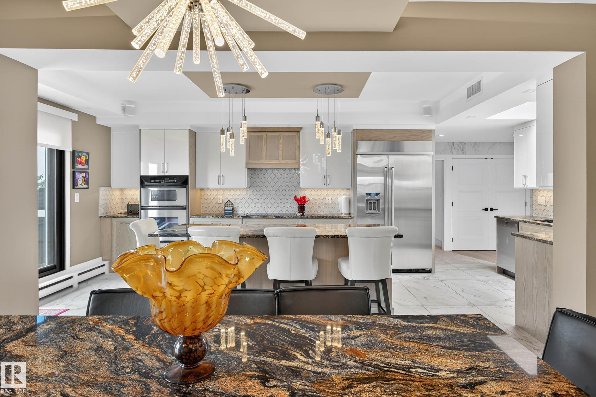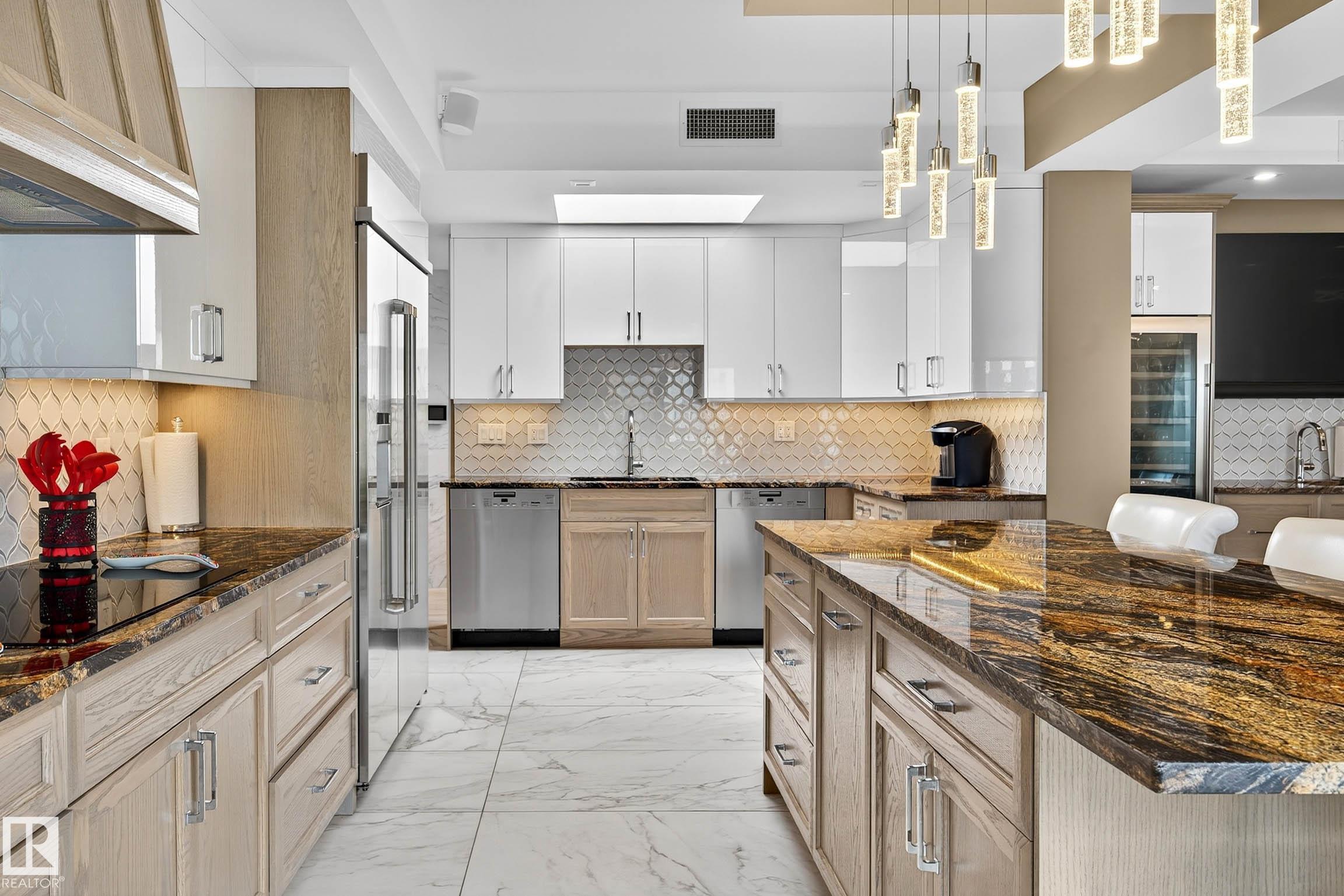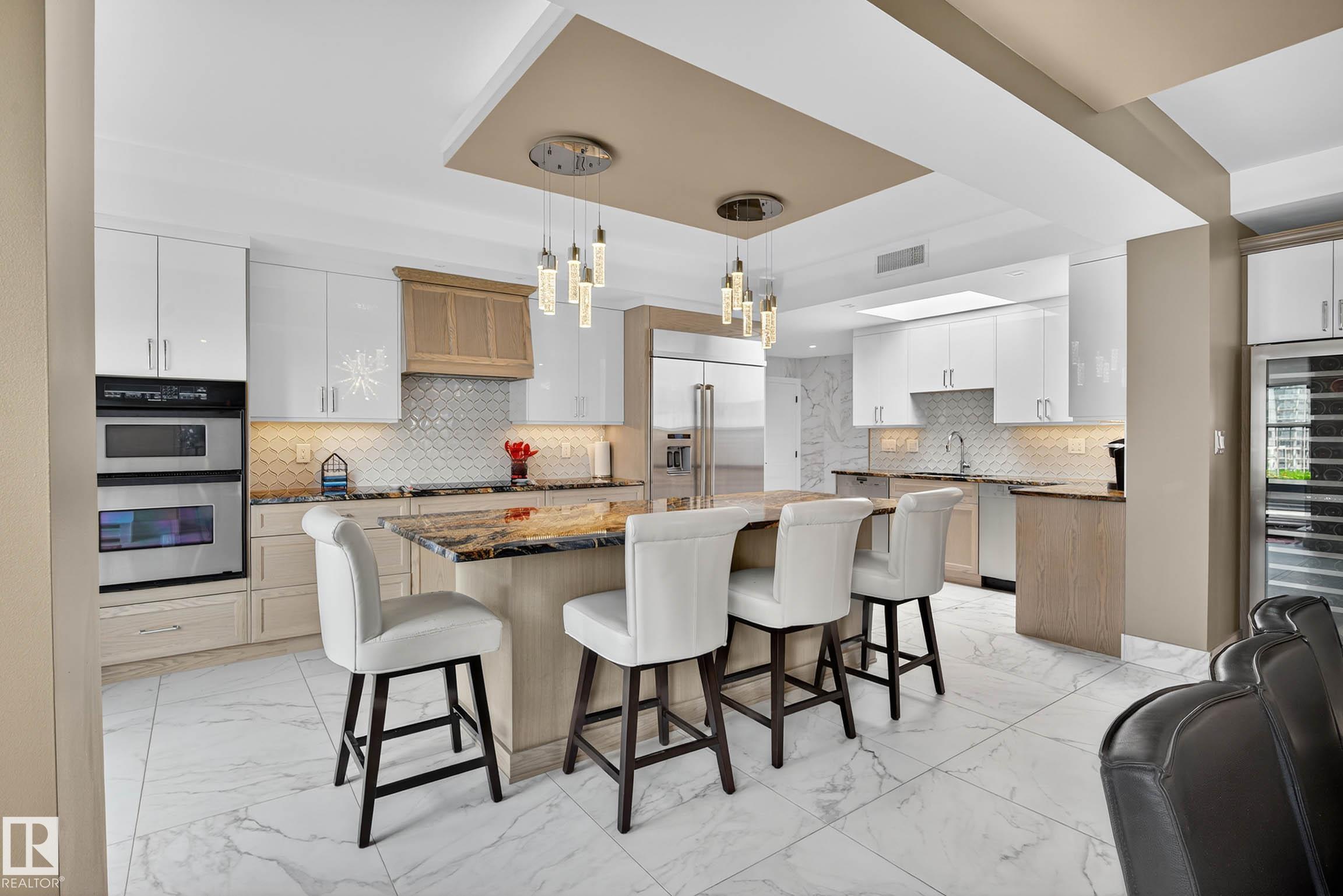 Breathtaking Penthouse ? Fully Redesigned ?Impeccable attention to detail ? Luxury, design & location converge in this spectacular 3039 sq ft, 3 bdrm, 4 bath residence overlooking Edmonton?s stunning River Valley. With no expense spared, this one-of-a-kind residence showcases premium finishes, new mechanical systems, sound proofing and the latest in modern design innovation. Your private elevator opens to a floor plan bathed in natural light, offering floor-to-ceiling views of the river valley, golf course, city skyline, and beyond. The chef-inspired kitchen is a showstopper w/quartz countertops, massive centre Island, custom cabinetry & high-end integrated appliances. Each room flows seamlessly onto a private wrap-around terrace ?ideal for entertaining or quiet reflection.The primary suite & second bedroom (each with city views) have ensuites w/custom WI closets. Every inch of this home has been thoughtfully curated with premium materials, timeless elegance, and smart functionality + 3 Parking Stalls.