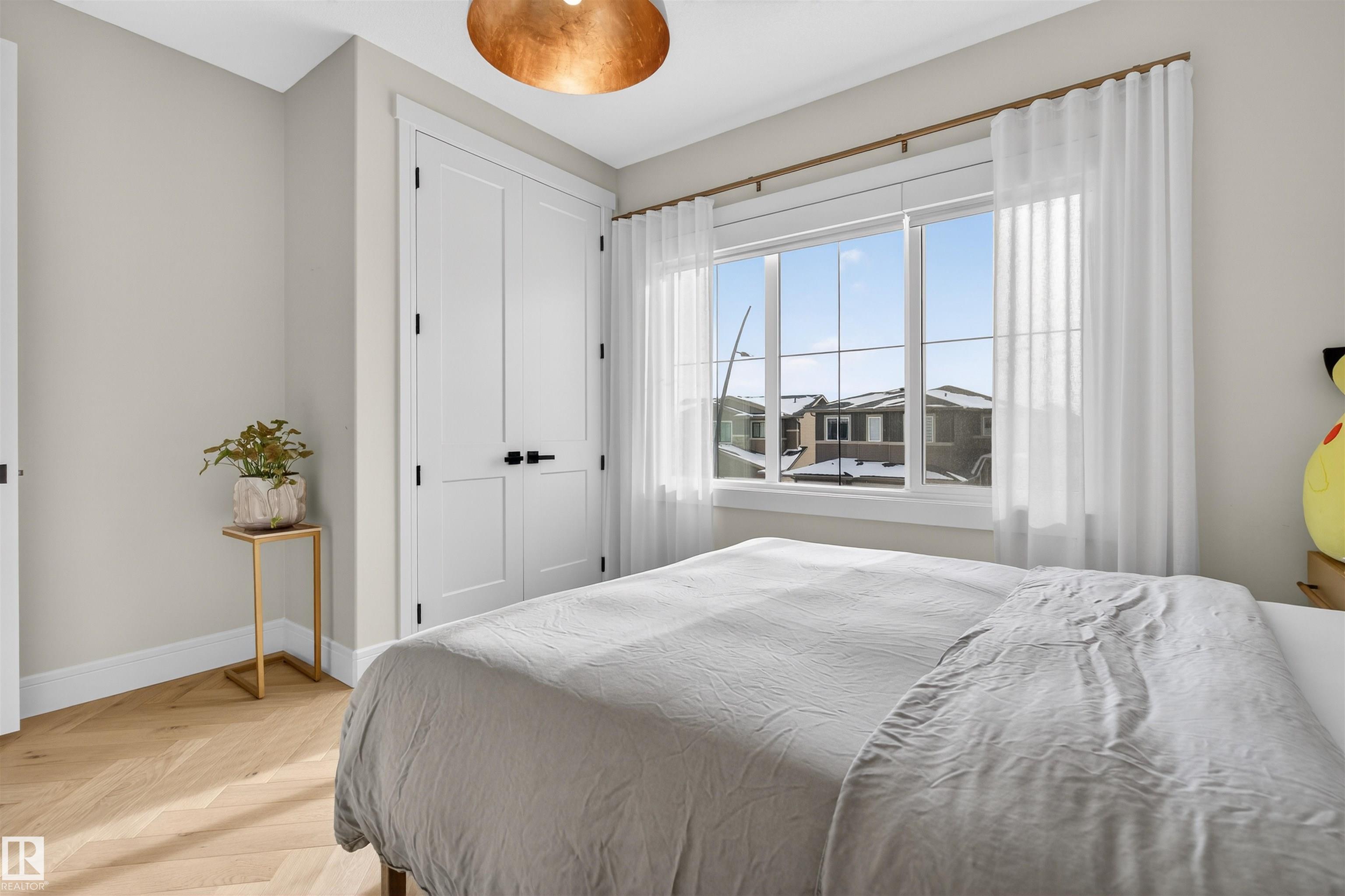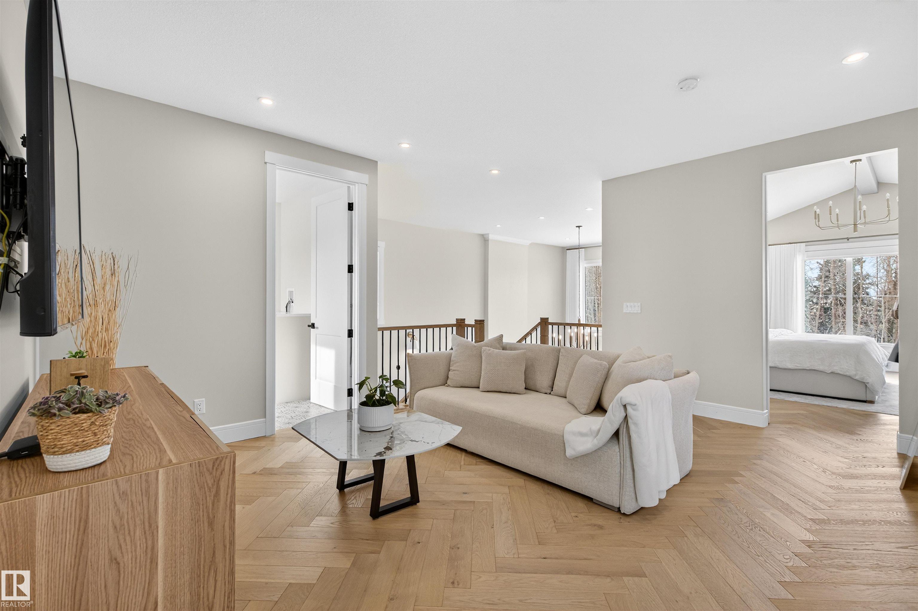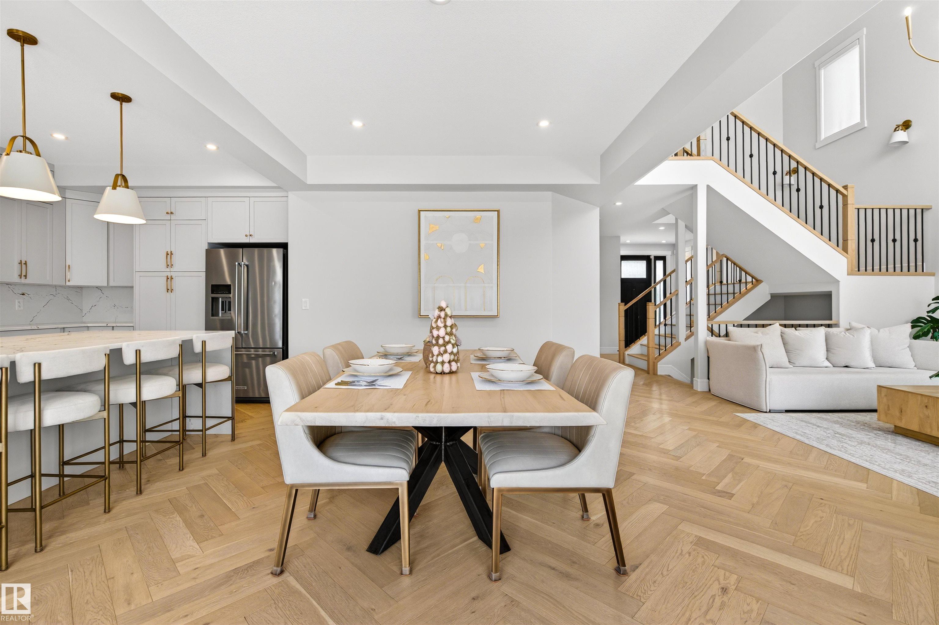 This elegant custom built home blends timeless architecture with refined, minimalist design. Perfectly positioned along an extensive walking trail & forested green space offers both privacy & a serene natural backdrop. All details curated for comfort & family living. Stunning, spacious kitchen showcases a luxury leather-touch Cambria Quartz Island, gas range & hidden butler?s pantry with direct access to the garage. The open-concept main floor is graced by an open stairwell leading to the upper loft, creating a sense of light & architectural interest. Upgrades include Hardwood Flooring, Oversized Windows, Custom floor-to-ceiling Drapes, main-floor office & large upper laundry room. With 4 bdrms, 3.5 baths, A/C &Triple garage. This Home is perfect for all family sizes. The Fully finished basement has a stylish wet bar, recreation room, an extra bedroom & a 3-piece bathroom?perfect for guests & entertaining. Walking distance to park, playground & transit, this home blends luxury, comfort, and convenience.